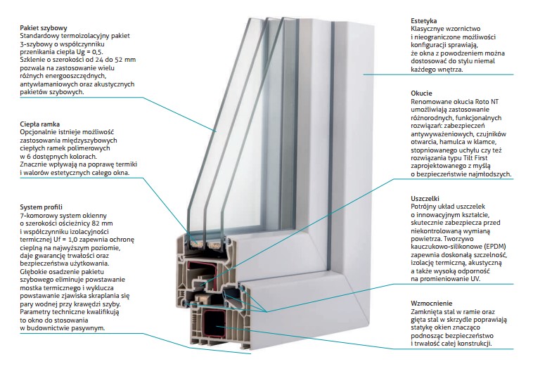 Okna Petecki Future Line 82 MD opracowaliśmy z myślą o nowoczesnych projektach budownictwa niskoenergetycznego. Standardowy pakiet 3 – szybowy o współczynniku U =0,5 znacząco obniża zużycie energii. g Zastosowanie 7 – komorowych profili Softline 82 firmy Veka wyposażonych w potrójny system uszczelek, pozwala na produkcję okien o jednym z najlepszych współczynników przenikania ciepła. Głębokie osadzenie pakietów 3 lub 4 – szybowych umożliwia skuteczne wyeliminowanie mostków termicznych. Rewelacyjne parametry termoizolacyjne w połączeniu z klasycznym wzornictwem, sprawiają że okna te są unikalną propozycją dla inwestorów planujących budowę domu niskoenergetycznego i pasywnego.
